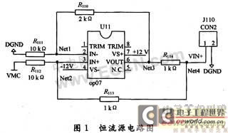 恒流源电路如图1所示。其中芯片OP07为运算放大器,它和5个电阻组成恒流源电路,在VIN+处输出1 mA的工作电流。图中DGND=5 V,VMC=0 V,有4个节点分别是NET1,NET2,NET3,NET4。设流过R110的电流为Ia,流过R114的电流为Ib,单位为mA,方向都向右。
